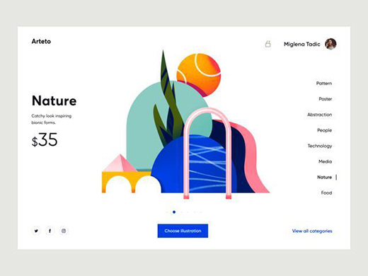 如上圖插畫的比重很大,在設計這種大的元素時,你的每個元素比例和細節處理都被同時放大了,我們可以看見這副插畫四周還運用了很多元素,讓頁面達到平衡,同時這個畫面和旁邊的文字場景也很好融合在一起。