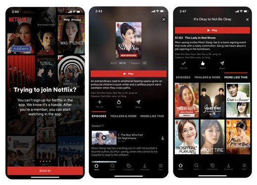 Netfix:知名的電影軟件Netfix在設計中,充分運用色彩去增強層次,無論是在引導頁按鈕設計,還是在頁面核心行動點,以及Tab切換等地方,都通過顯眼的主色來引導用戶操作,讓頁面的行為路徑更加順暢。
