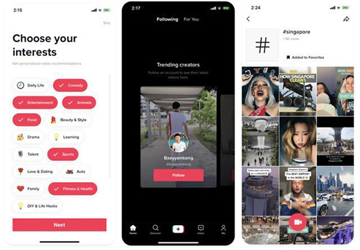 Tiktok:抖音海外版本設計,整體UI部分非常簡單,頁面還是一如既往突出內容為主,所以在整個設計上就通過色彩來強調頁面優先級,比如拍攝,分享,選擇這些核心操作都通過色彩來引導完成任務。