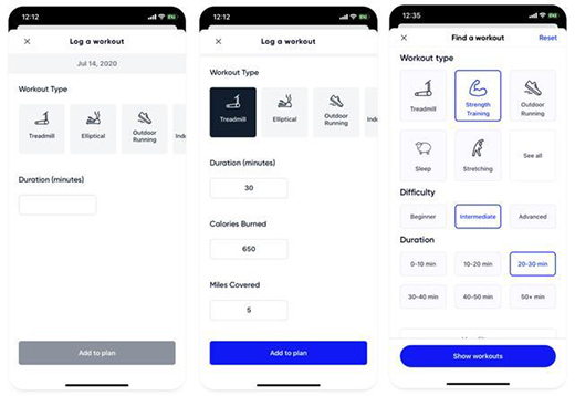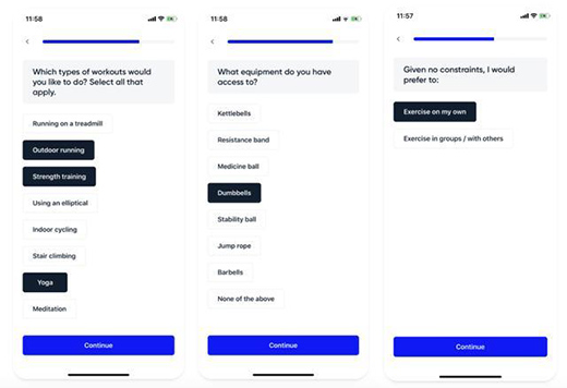 比如aaptiv這個產品的功能頁面設計,就是運用了視覺重量的對比,線框按鈕最弱,其次是黑色選中效果,最重的功能引導按鈕,視覺重量的對比能很好讓用戶關注到功能內容。