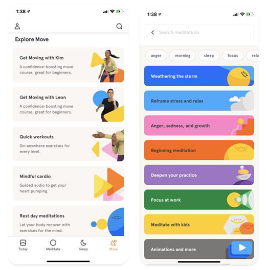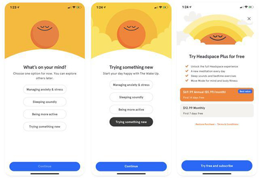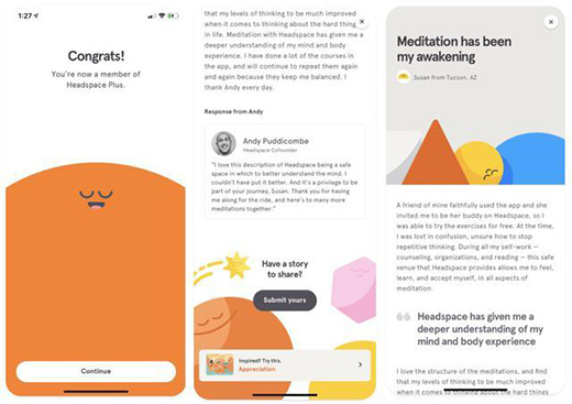 headspace這款產品我非常喜歡,將情感化用到了極致,在頁面很多細節地方運用了不同的小橙人在背景上,視覺重量有輕有重,通過不同視覺重量來表達頁面內容,非常巧妙。