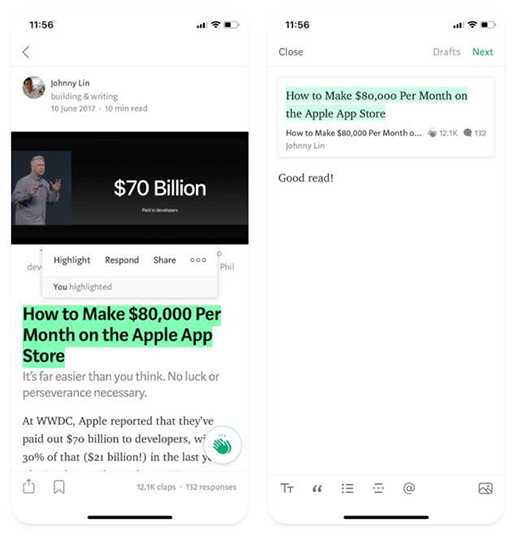 設計師熟悉的medium官方App設計,在正文閱讀時,同樣采用不同的視覺重點來突出重要信息,比如左邊通過字重以及文字背景綠色底色和正文對比,非常醒目,右側通過淺綠色作為背景強調突出。